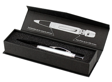 Bolígrafo metálico con USB Pen Drive 4 GB incorporado. Presentación en Estuche de Cartón texturado negro.