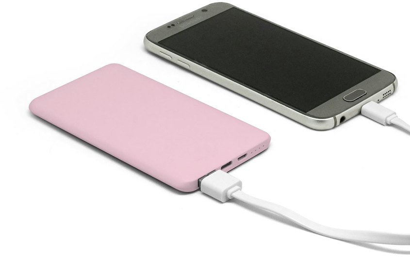 Cargador externo con diseño ultra fino. Incluye cable de carga con conector micro USB.