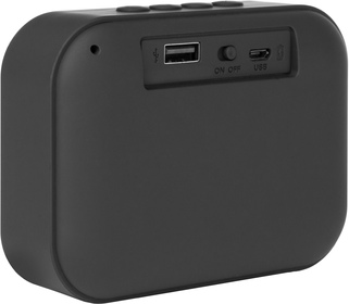 11 x 8 x 4 cm. Plástico engomado y tela. Parlante bluetooth. En la parte superior tiene botones de Modo, volumen y Play. Con el botón Modo se elige entre las opciones de Bluetooth y USB. Opción de responder llamadas desde el parlante pulsando una vez el botón Play cuando entra la llamada. En la base detalles antideslizantes. Alcance de transmisión hasta 10 mts. Voltaje DC 5V. Incluye cable USB para carga.
