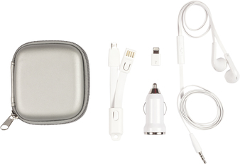 9,4 x 8,5 x 3 cm. Plástico. Estuche con adaptador/cargador entrada USB. Cable con adaptador mini USB. Audífono con micrófono.